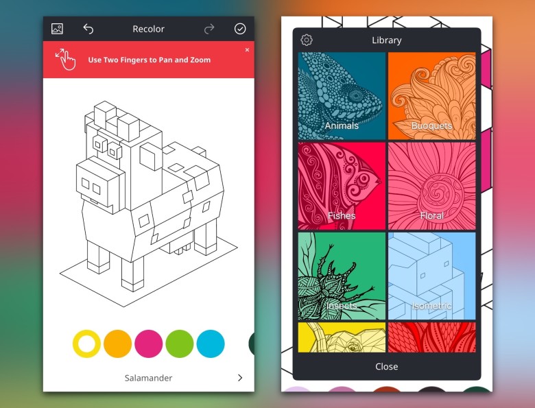 Új, vagy másik mintát, a színező felületen keresztül, a bal felső sarokban található jelre kattintva választhatunk magunknak. Az applikáció könyvtárában 10 téma szerint csoportosították, a több mint 200 illusztrációt, melyek legtöbbje rendkívül részletes, csodaszép alkotás. Például vannak köztük állatok, növények, halak (mondjuk nem értem, hogy ők miért nem az állat kategóriában kaptak helyet), mandalák, sőt még koponyák is. Minden csoportból 3-mat színezhetünk ki ingyen, a többiért kategóriánként 0.99 eurót, illetve az összesért együttesen 4,99 eurót kér tőlünk a program.