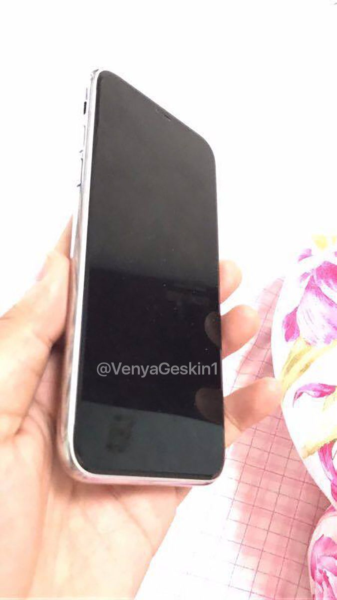 A képen az „iPhone” fényesre csiszolt rozsdamentes acélszélekkel, káva nélküli kijelzővel, valamint hátsó üvegborítással látható. Duál kamerának igen, hátlapi ujjlenyomat-olvasónak viszont semmi jele, ami akár a kijelzőbe épített szenzor hírét is alátámaszthatja.