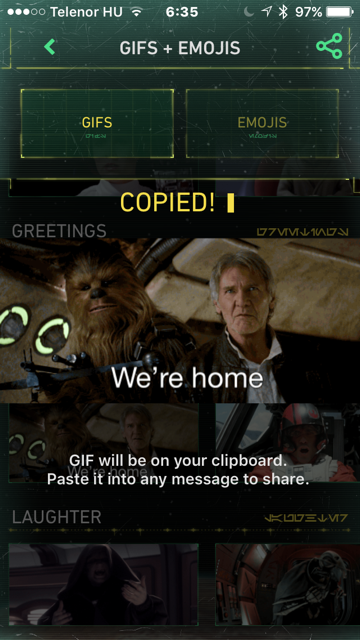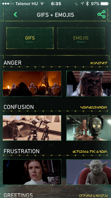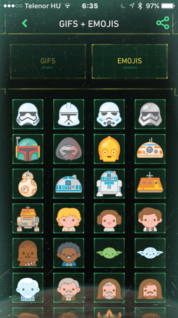 Az egyelőre még csak az USA AppStore-ban elérhető, ingyenes applikáció nem csak hangulatjeleket kínál: többek között megtalálhatóak rajta a Star Wars-os hírek és újdonságok, hangeffektek, sőt, még egy szelfi generátor is.