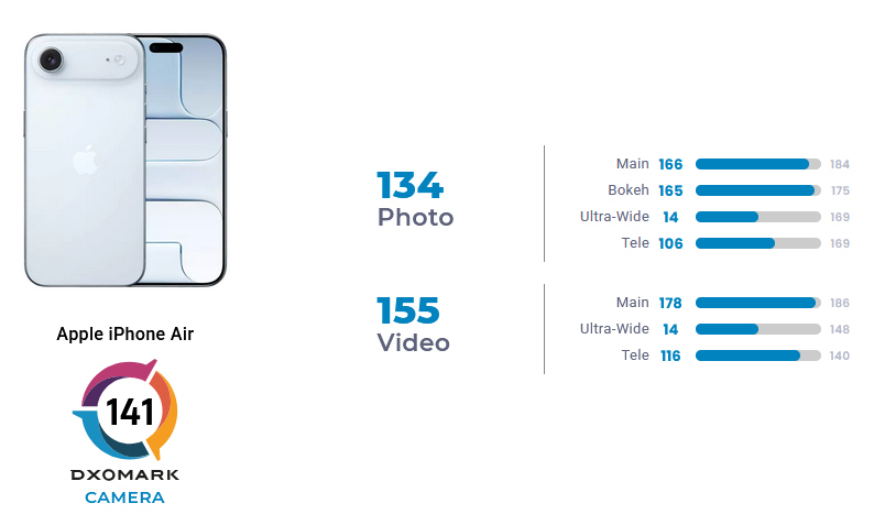 Az iPhone Air holtversenyben a negyvenkettedik a szintén 141 pontra értékelt iPhone 13 Próval, iPhone 13 Pro Max-szel és Xiaomi Mi 11 Ultrával, és egyetlen ponttal veri közvetlen riválisát, a némileg hamarabb debütált Samsung Galaxy S25 Edge-et.